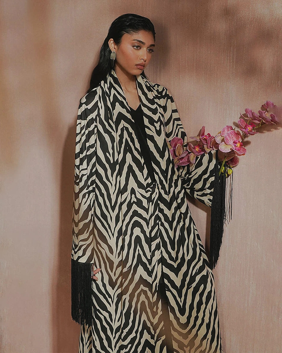A luxurious kaftan crafted in mulberry silk with a classic zebra pattern. It features long flowing sleeves finished with delicate lace fringes and an attached scarf. Paired with our black inner shirt and trousers to complete the look.
